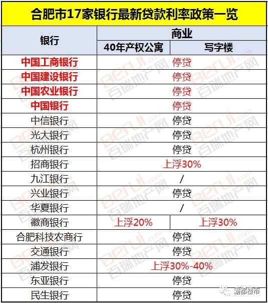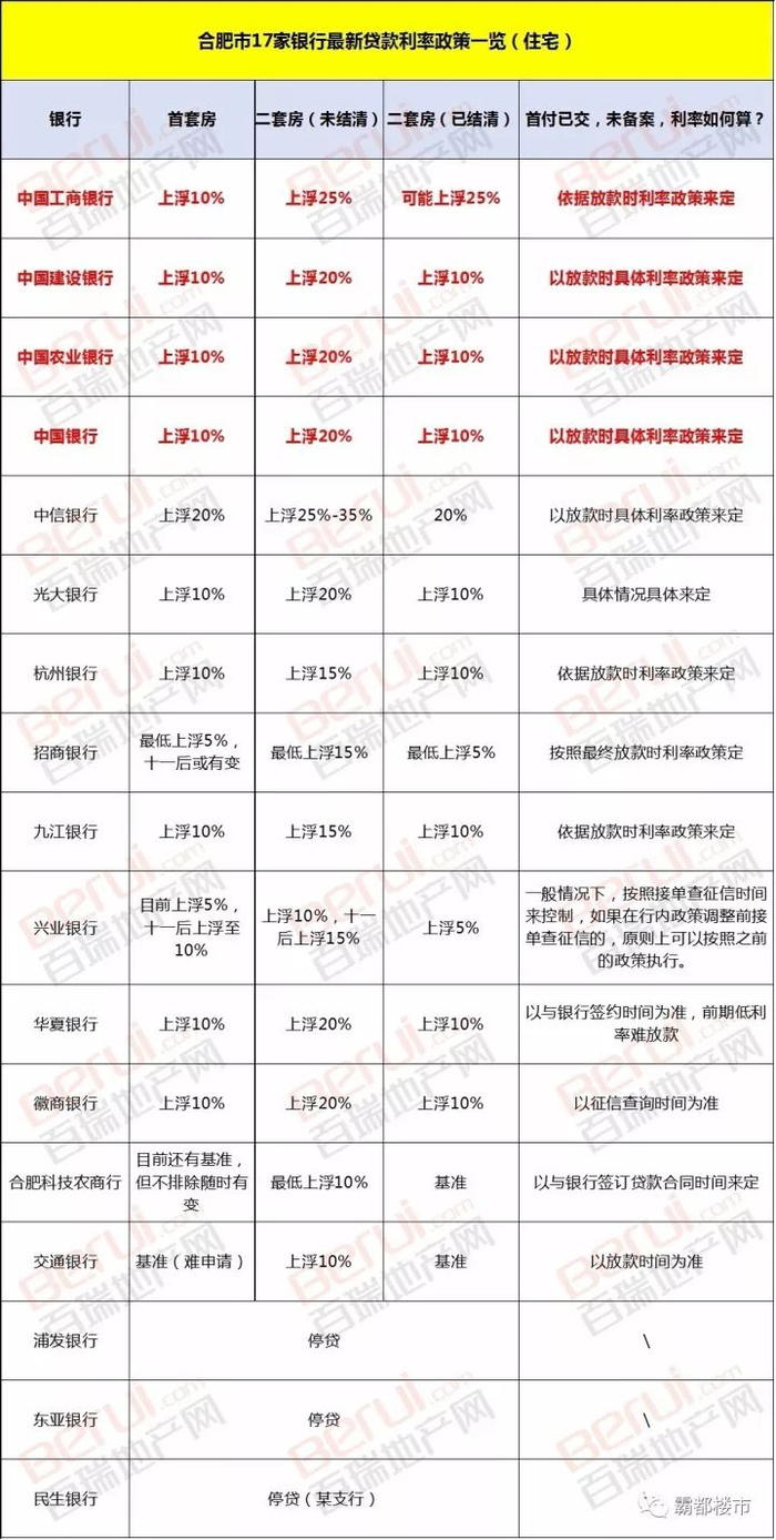 百瑞地产网对合肥市17家主流银行的住宅、商业贷款以及具体利率结算情况进行摸底,获得结果如下: