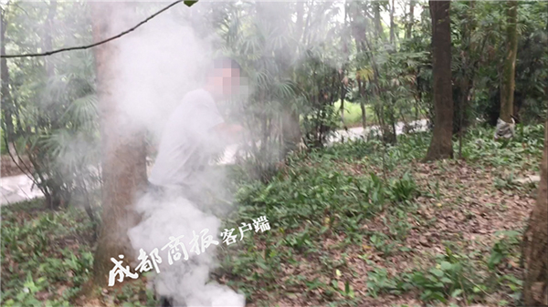 “他们基本上就是在11点到下午1点的这个时间段来,这边游人相对较少,没人注意就开始燃放烟雾。”陈钢介绍。而就在这时,记者就发现了在前方的一个树林内升起了一股浓烟。见状,陈钢也快步上前,边走边喊“把它灭了。”