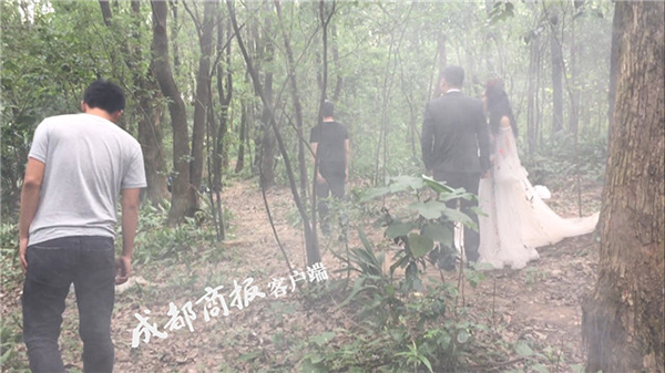 28日中午,成都商报客户端记者与陈钢一起来到了后山的生态园、千丈林和大草坪片区。“来这后面拍婚纱的人多得很,每天都有好多对,说不定现在就有人在放烟。”陈钢边走边说。而就在记者通过大草坪和生态园树林时,不足百米的距离就先后遇上了5对新人在此拍摄婚纱照。