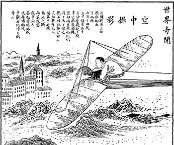 而与此同时,对国人而言,飞机航拍就如同其他舶来品一样,乃是一桩新奇事物。只不过,当时鲜有能亲眼目睹航拍具体情形的,所以这件新事物仍停留在国人对异域的想象范畴里。1911年上海《图画报》74期刊登一幅新闻画,标题是“世界奇闻——空中摄影”,配以简短文字,介绍法国人乘飞机在空中摄影事。画中一架单翼螺旋桨飞机翱翔于空,机上坐一男子,一手操持方向轮,一手控制照相机箱,俯瞰拍摄地面山川屋舍。画中人物和飞机比例失当,人物相对飞机显得过大,但鉴于我国美术向来不太注重写实的传统,此点姑且置之可也,但以一人兼顾飞行和摄影,以当时技术条件论,不啻天方夜谭。《图画报》既然名此图“世界奇闻”,自然视其为新闻报道,而所绘情景,无疑去真相甚远。这固然可能缘于画师对航拍缺乏了解,作画一凭耳食和自我发挥,但也可能画师明知实情如何,却依然做了这样的“艺术化处理”。比起客观勾勒,艺术化的图景未免稍嫌神奇,可也更能突显画面中飞机和摄影两大元素的结合。无论如何,此图画折射的是国人面对新兴的空中航拍啧啧称奇又饶有兴趣的态度,它十分契合了当时国人对航拍的想象和演绎。