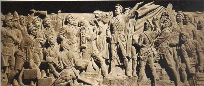 碑身的西面,第一幅是“八一南昌起义”的浮雕。画面从一个连队的角度来表现这一伟大起义的情景。1927年8月1日早晨,一个指挥员挥着左手向战士们宣布起义,士兵们举着起义的信号——马灯,光辉的红旗举起来了,战马在呼啸,劳动人民在帮助搬运子弹,战士们激昂地高呼着。南昌起义,向国民党反动派打响了第一枪,展开了以革命武装反对反革命武装的斗争。紧接着的一幅是“抗日敌后游击战”,浮雕上显现出抗日战争时期太行山区敌后游击战的场面。远远望去,在一座雄伟峻峭的半山腰里,游击队员们正穿过高大的树林和茂密的青纱帐,去和敌人战斗。画面上,青年男女农民拿着铁铲,背着土制地雷;白发的母亲送枪给儿子,去打击日本侵略者;年轻小伙子站在指挥员身旁,等候命令,准备随时投入消灭敌人的战斗。