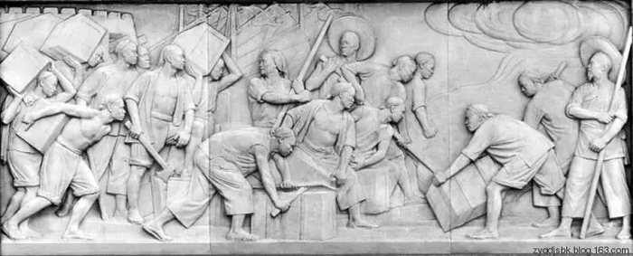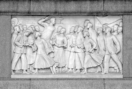 往南转到碑身的后面,看到的是1911年辛亥革命“武昌起义”的庄严画面。深夜,起义的新军和市民,摧毁了湖广总督府门前的大炮,正向总督府里冲去。总督府内熊熊的火焰冒向天空;总督府的牌子,被打断在阶前;撕碎了的清朝的龙旗,被践踏在地下。辛亥革命,结束了二千多年来的封建帝制。接下来的一幅是“五四爱国运动”。这是中国民主革命由旧民主主义革命转变为新民主主义革命的转折点。浮雕的画面显示出学生们齐集于天安门前举行爱国示威游行的情景。一群男女青年学生,举着“废除卖国密约”的旗帜,慷慨激昂地来到天安门前。梳着髻子、系着长裙的女学生,在向市民们散发传单。人群高处,一个男学生正在向围着他的群众演说。愤激的青年演说者,怒形于色的人群,使整个浮雕充满了痛恨卖国贼、激动人心的气氛。南面的第三幅是“五卅运动”。1925年5月30日,上海群众一万多人在南京路上举行反帝国主义大示威,英国巡捕向徒手群众开枪射击,死伤多人。“五卅惨案”引起了全上海以至全国人民的极大愤慨,促使全国范围的大革命风暴的爆发。这幅浮雕表现出由工人阶级领导的各界人民坚强不屈地向帝国主义斗争的情景。画面上成千上万的工人、学生、市民举着“打倒帝国主义”的小旗,冲破英国巡捕的沙袋、铁丝网英勇地前进;商店关门罢市,戴着礼帽的商人也加入了斗争的行列;被打伤的工人,在战友们搀扶下,继续勇往直前。人群后面,隐约看到外滩的海关和银行大楼。
