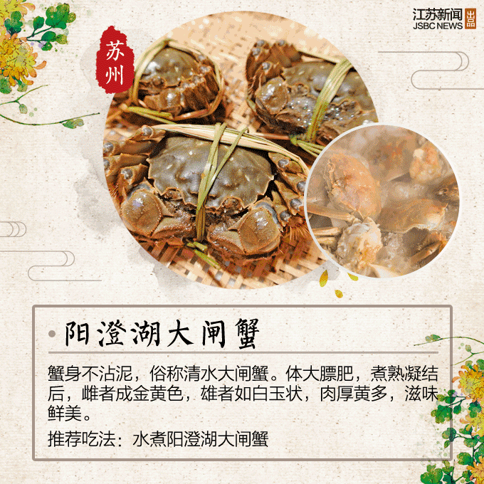 阳澄湖清水大闸蟹,学名中华绒螯,肉质膏腻,煮后呈亮橘红色,口味鲜甜。