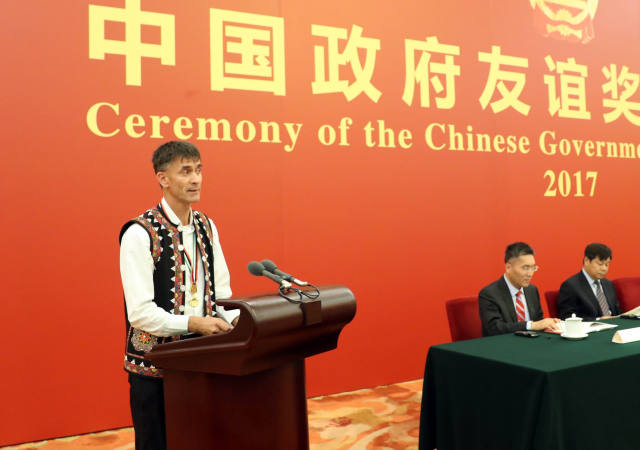 29日下午,身着云南哈尼族传统服饰的夏爱克来到人民大会堂,同其他获奖的外国专家一道,参加中国政府“友谊奖”颁奖大会。1991年至2017年,已有来自70个国家的1549名外国专家获奖。