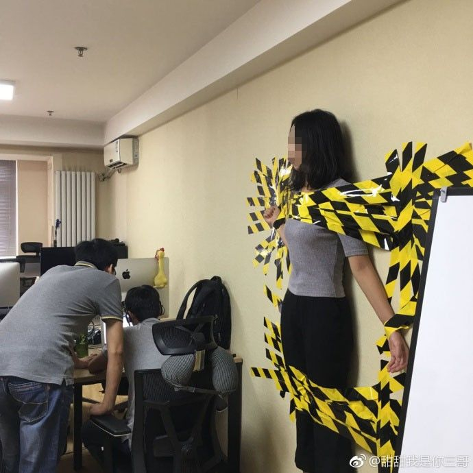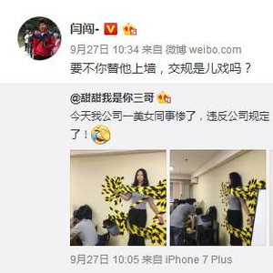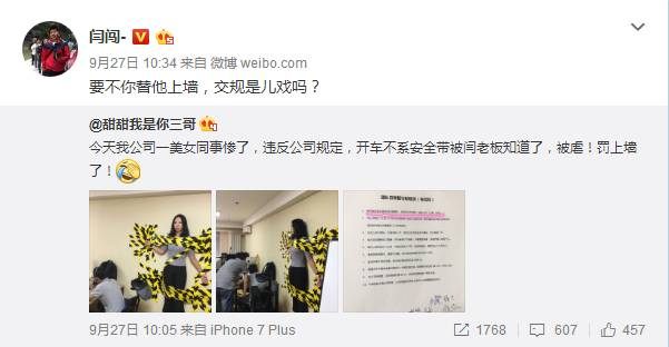9月27日,闫闯转发微博称,其公司的一位女同事因为违反公司规定,开车不系安全带而被虐!罚上墙了!