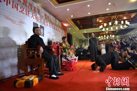 中新网成都9月30日电 (记者 张浪)隐没江湖10年的“荣派”川菜重出,最为古雅、隆重的收徒仪式再现。9月30日中午,元老级中国烹饪大师、川菜第二代传人王开发在成都举行隆重的收徒典礼,年过半百的李作民成为王开发大师的关门弟子。