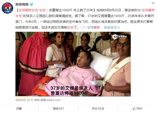 9月25日,曾被评为“全球最胖女性”