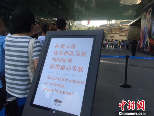 记者注意到,在距离博物馆正门10米处立着一块指示牌,上面写着“距离入馆还需排队等候约30分钟,请耐心等候。”,尽管如此,等待入馆参观的观众人数仍居高不下。