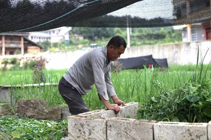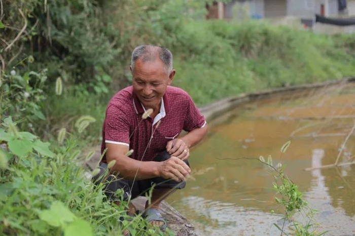 今年62岁的村民彭术生在自家塘边扯杂草。村民彭术生新种的几百株水蜜桃,让他赚到了1800元,而他身后这5亩水塘里养殖的甲鱼、虾子,预计今年会带来3万余元收入。