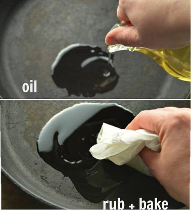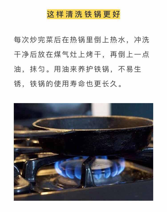 每次洗完锅后在铁锅的表面抹上一层油,时间长了,在铁锅的表面就会形成保护层,有不粘锅的效果,也更省油。