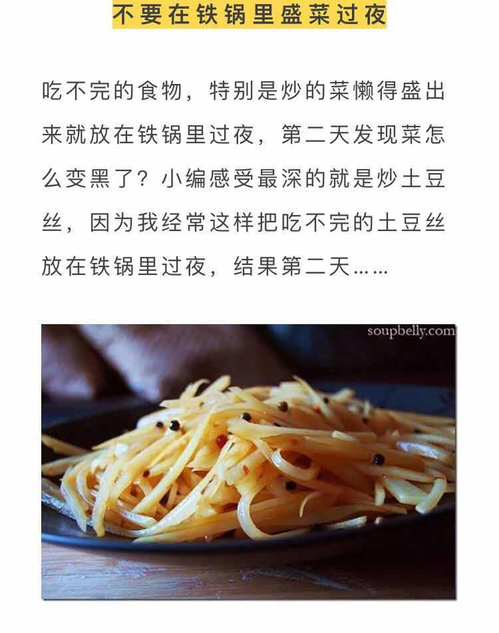 铁锅里的过夜菜会释放出水分,造成铁锅生锈,除此之外,在酸性条件下,铁锅中的铁元素会破坏食物中的维生素,不利于人体健康。