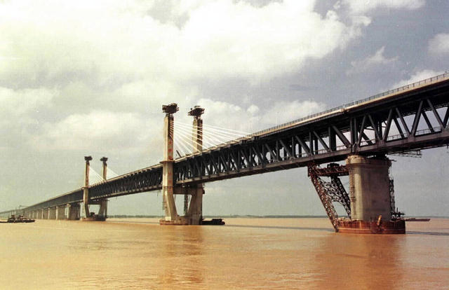 南亚孟加拉国帕德玛河下游,全长近10公里的在建公铁两用桥梁帕德玛大桥,桥墩与桥身正在同步施工。