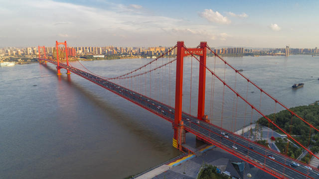 武汉长江二桥(2017年7月11日 新华社记者 熊琦摄)。在材料上——武汉长江大桥所用桥梁钢全部从国外进口,芜湖长江大桥上首次使用国产Q370(一平方毫米能承受37公斤的拉力)桥梁钢,在建沪通长江大桥使用的国产桥梁钢强度达到Q500。