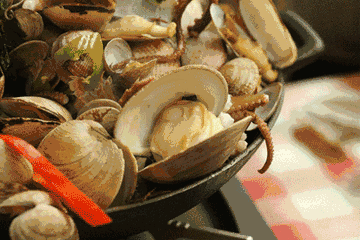 一点水也不加,干锅煮,开锅不多会儿就能听到‘啪啪’开口的声音,不要打开锅盖,等个三分钟到五分钟,这样做出来的蚬子肉很嫩。