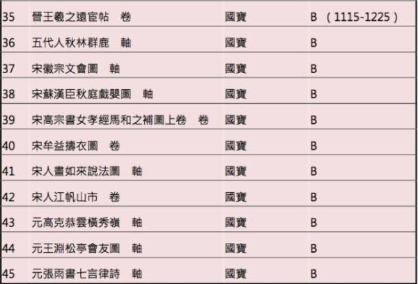 “国宝的形成”特展,共计选展45件,其中国宝级书画34件、重要古物11件。其中包括东晋王羲之,唐代韩幹、宋代燕文贵、文同、徽宗赵佶、高宗赵构、陆游、朱熹、苏汉臣、牟益,元代高克恭、赵孟頫、陈琳、吴镇、张雨、赵雍、卫九鼎、倪瓒,明代边文进、戴进、商喜、唐寅、仇英,清代王翚、恽寿平等人的代表作品,件件俱为美术史中声名赫赫的一时之选。