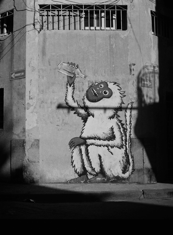 他把博尔赫斯的文学作品《动物寓言集》拿来命名这个摄影系列。虎头从斑驳的墙面上浮现出来,猴子在铁窗下倒空手里玻璃瓶最后一滴液体,乌黑一团的抹香鲸以巨大体量无声无息地从街角游转过来——他似乎看到了大量对现实的隐喻,那些动物与街头的关联无不在诉说个人与社会的议题,人类生存、政治状态、社会结构,等等。