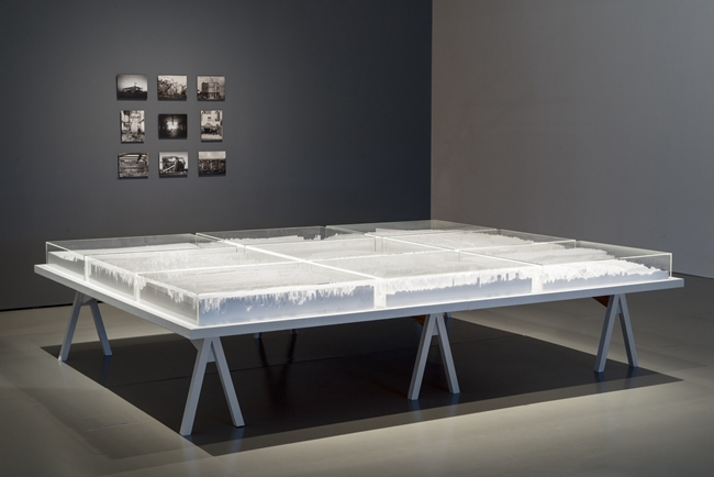 艺术家在雅典拍摄的九张黑白废墟照片挂在墙壁上,前面桌子上放着九个大小统一的透明盒子,分别罩着一块块表面参差不平的白色塑料泡沫。只有你不断观察照片与塑料泡沫,才会渐渐发现两者之间是放大、拓印的关系。