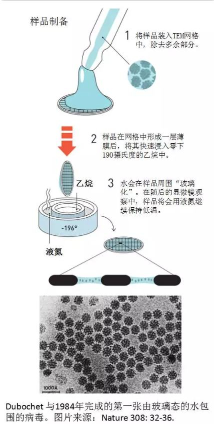 Jacques Dubochet 让使用电子显微镜观测含水样本成为可能。一般来说,电子显微镜需要在真空环境下工作,样本中的水分需要被蒸发,从而破坏样品中的生物分子。因此在20 世纪 80 年代,Dubochet 成功将水溶液环境迅速冷却转变为玻璃态,将周围的生物分子冻结,使生物分子能保持其天然结构状态,以便于显微镜观察。