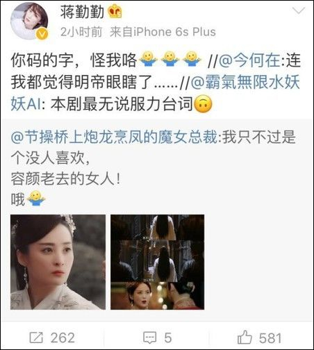 PS:今何在是《九州·海上牧云记》原著作者,蒋勤勤在剧里饰演的是大端皇帝牧云勤的皇后。连今何在都觉得牧云勤眼睛瞎了……