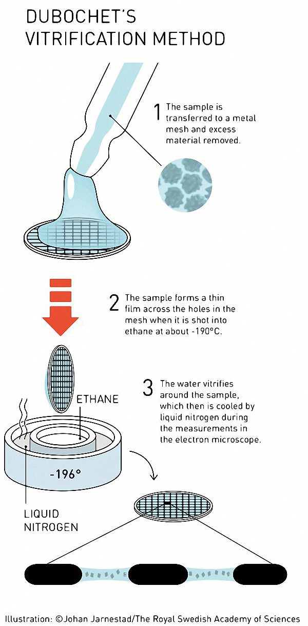 迪波什得出的方法是对生物样品进行玻璃化(vitrifying water)。一般情况下,通过氢键的相互作用,水分子会在凝固过程中形成有序排列,形成晶体。而迪波什想到的即是在水分子相互作用之前就让其凝固,将生物样品浸入事先经液氮冷却的乙烷中,就能使水迅速冷却、在数毫秒之内完全凝固,这种方式得到的就不是晶体而是无定形态,而玻璃也是处于无定形态,玻璃化名称由此而来。生物样品嵌在无定形冰中,堪称留下了真实的一瞬间。