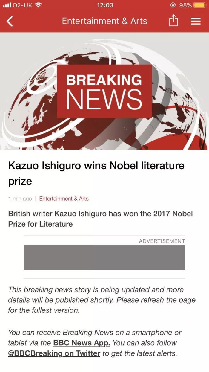 据BBC消息,刚刚揭晓的诺贝尔文学奖,由英籍日裔作家石黑一雄获得!