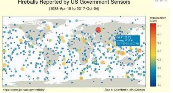 据美国国家航空航天局(NASA )公布的卫星观测结果,北京时间2017年10月4日20时07分05秒,地球发生一次小行星撞击事件,撞击地点为中国云南香格里拉县城西北40公里处,爆炸当量相当于540吨TNT(一种烈性炸药)。小行星相对地球的速度为14.6千米/秒,空爆高度为37公里。