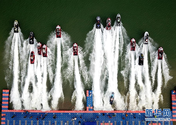 9月28日,在广西柳州静兰水上运动基地,选手参加中国柳州国际水上摩托公开赛。新华社发(黎寒池 摄)