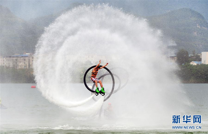 9月28日,在广西柳州静兰水上运动基地,选手在中国柳州国际水上摩托公开赛上参加坐式水上飞人花样赛。新华社发(黎寒池 摄)