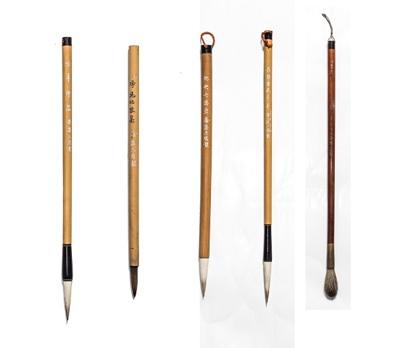 这次展出的二十多支毛笔分别有杨振华、李鼎和、邵芝岩、老臣元、屯镇胡开文、老胡开文发记、李福寿、徐葆三、(日)玉川堂等制作。有的是于右任、张大千、吴湖帆、冯超然等名人的定制笔;有的笔杆是难得一见的冯公侠微刻字画象牙杆、菠萝漆杆;有的笔头是仿唐緾纸法所制。