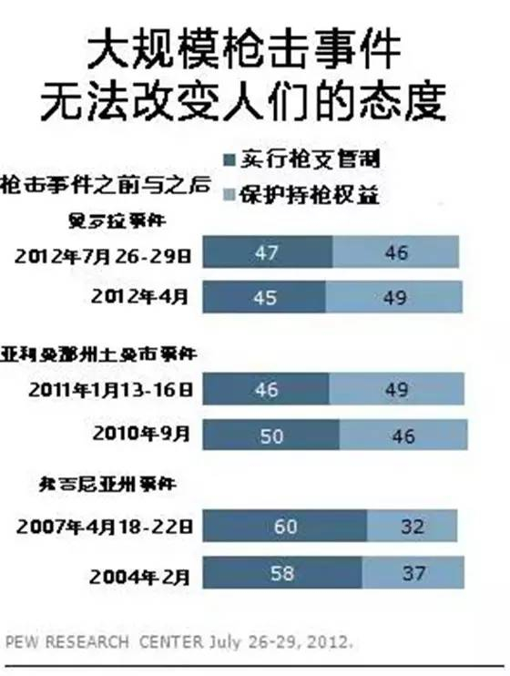 下图显示:尽管大规模枪击事件常常让所有人都为之心痛并指责枪支是罪魁祸首,但这些事件并没有真的影响到公众对这个问题的看法和态度。