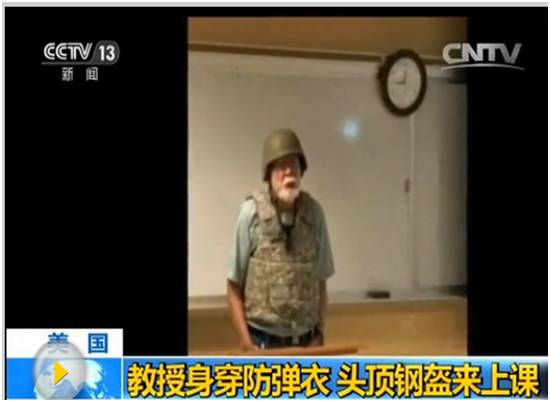 同股票一起猛涨的,还有防弹衣销量。2015年的时候,加州一起枪击案发生后,当地防弹衣的销量就猛增。下图为一位教授上课时身穿防弹背心: