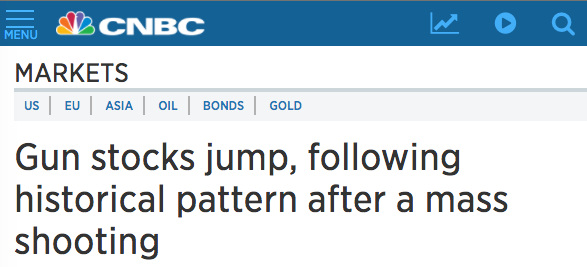 对此,媒体的解释是:这是因为,枪械股的投资人猜测枪击案发生之后美国人民会开始疯狂购枪保护自己的安全。