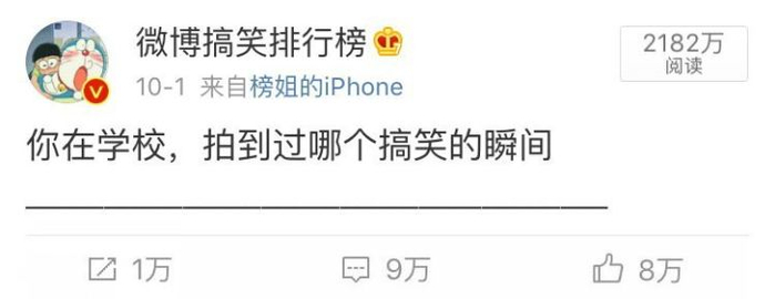 前几天,微博话题“你在学校,拍到过哪个搞笑的瞬间 ”引起了大家疯狂回复~前后共有2182万阅读数,9万评论!