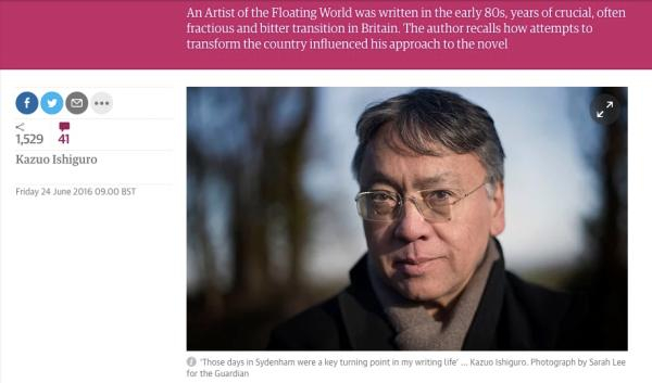 2016年,石黑一雄为英国《卫报》撰文回忆写作《浮世画家》的心路历程。此图为《卫报》网站截图。