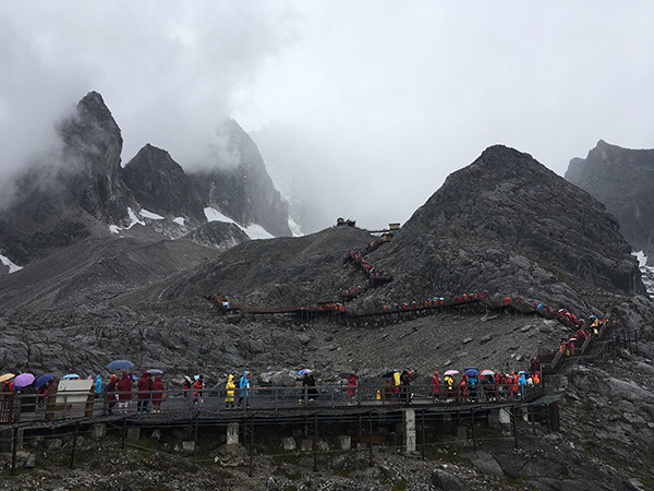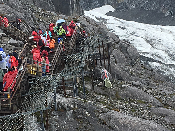 10月3日14时许,玉龙雪山海拔4506米的游客观景台上,风挟裹着细雨,气温快接近零度,但游客的兴致不减,他们穿着雨衣、手拿着氧气罐,依然向海拔4680米的冰川公园喘着粗气爬去。