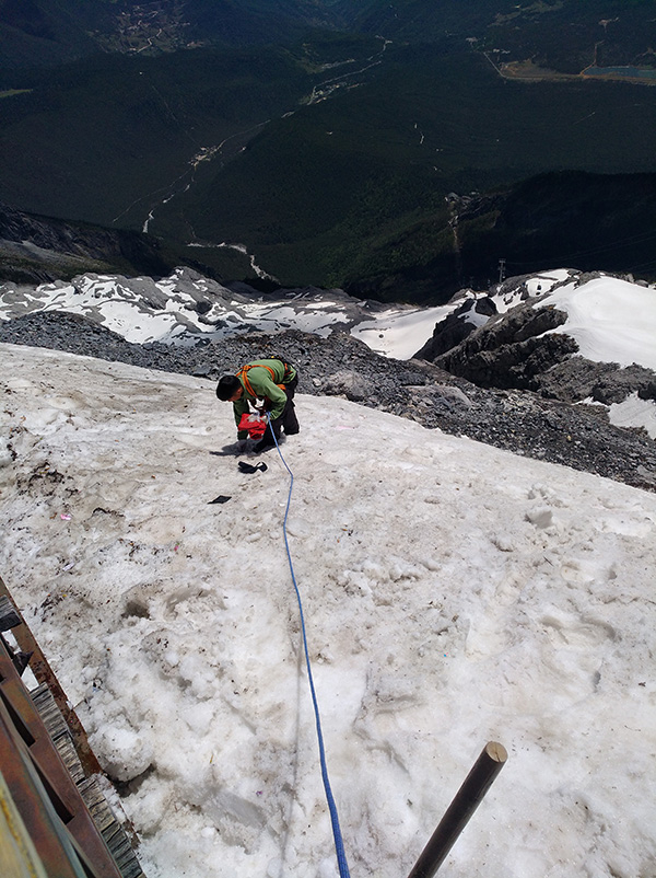海拔4500多米,风“呼啦啦”吹着哨子。李杨林顾不上缺氧和下雨,他得留意脚下的万年冰川、身后的悬崖峭壁。