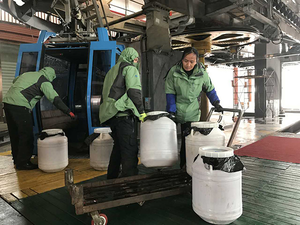 据李杨林称,像此次国庆黄金周,环卫工每天在雪山捡垃圾150至200袋,每天14时许两个索道箱专门清运上午捡的垃圾下山,下午捡的垃圾在下班撤走的同时被运走。