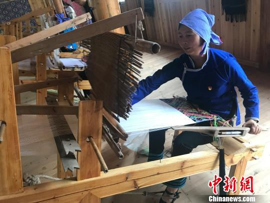 粟田梅向记者演示侗锦织造过程 傅煜 摄