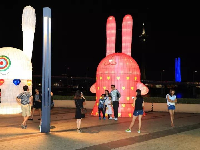 国庆黄金周期间,澳门壹号广场展示了由著名建筑师及艺术家马若龙设计的玉兔花灯,吸引大批市民和游客观赏。