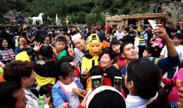 10月6日,中国猴山——河南济源五龙口,曾因开大巴被交警拿住而意外走红网络的“孙大圣”遭游客围追堵截,男女老少争相求合影,猴哥难以脱身,只好求助安保人员前来解围。