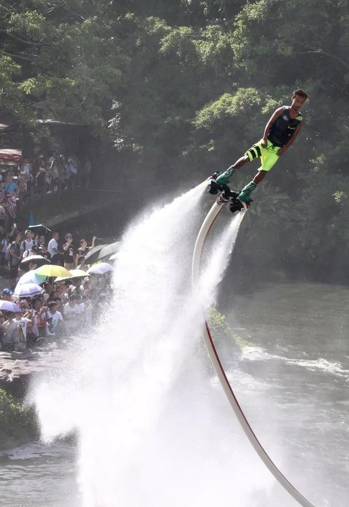 2017年10月1日,深圳世界之窗景区“水上飞”表演给游客带来感官刺激。