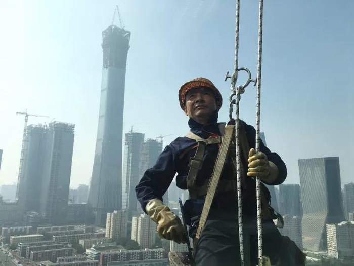 2017年10月6日,北京国贸附近的写字楼外立面,“蜘蛛人”在给大楼“洗澡”。