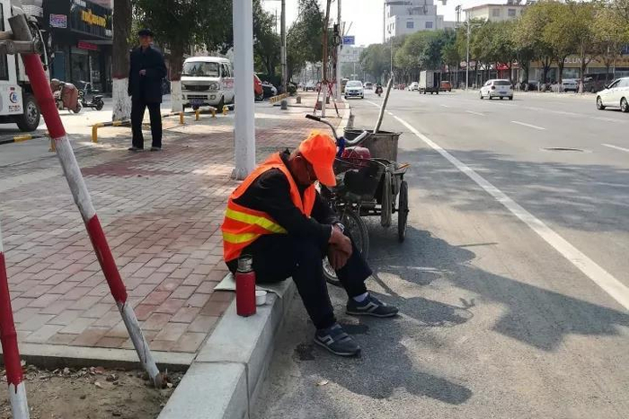 2017年10月6日,山东滨州,环卫工人在路边休息。