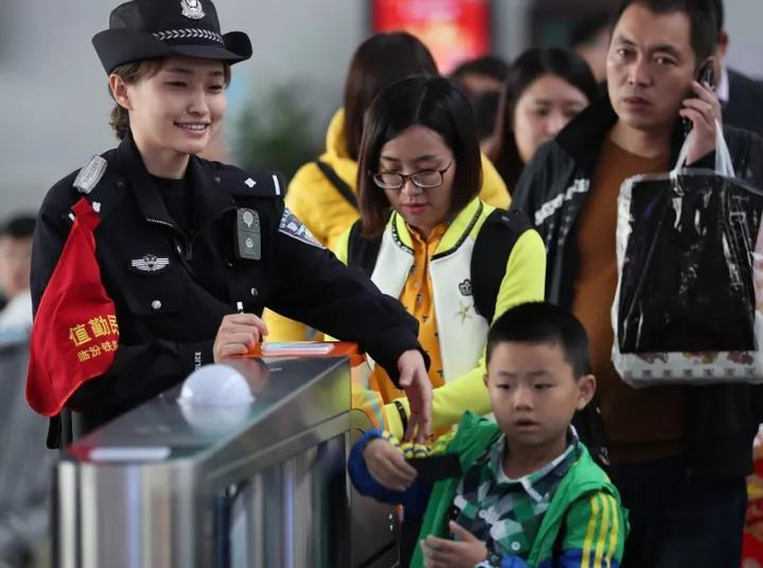 2017年10月7日,山西运城北站,铁路公安民警坚守岗位,全力疏导和维持旅客有序出站,一位小朋友在警察帮助下,安全通过进站闸机口。