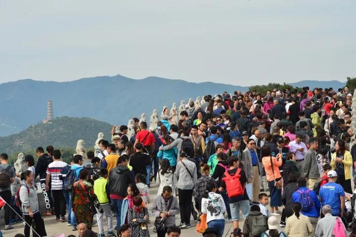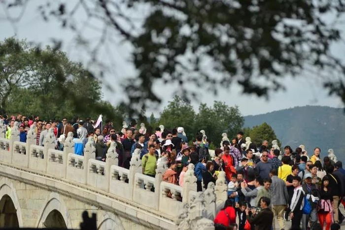 2017年10月3日,京城雨过天晴气温回升,颐和园迎小长假最大单日客流高峰,至午时,约近10万游客纷至沓来,景区重要景点和主要道路寸步难行。