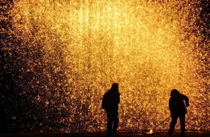 2017年10月5日,河南省内黄县薰衣草庄园举行打铁花表演。