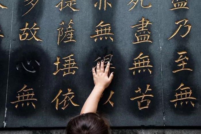 国庆假期,杭州灵隐寺内一处刻有经文的墙体前,大批游客伸出手触摸那些写在墙上的字,许多热门的字周边被游客摸得掉色, “心想多得”四个字被摸最多。