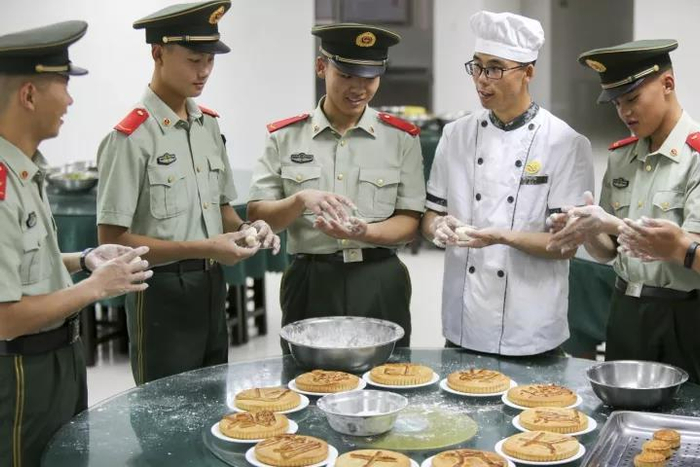 2017年10月4日,江苏泰州,武警泰州支队二中队官兵在糕点师傅的带领下学做月饼。
