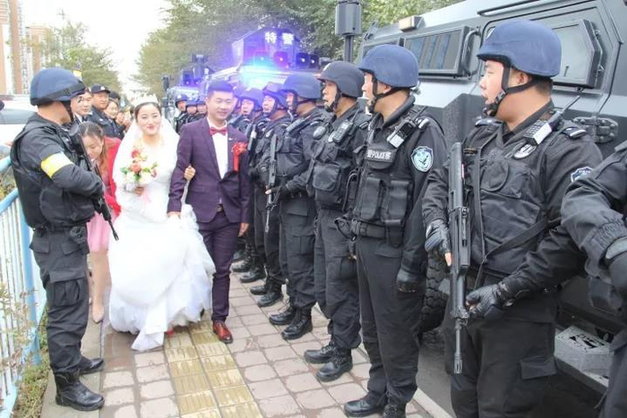 2017年10月5日,新疆石河子一家酒店旁,一众特警荷枪实弹夹道欢迎一对新人。新郎是石河子特警支队民警杨旭东,特警支队的同事因为工作原因不能参加他们的婚礼,执勤民警利用工作午餐间隙,在酒店门口用特殊的方式,为这对新人送上了真诚的祝福。