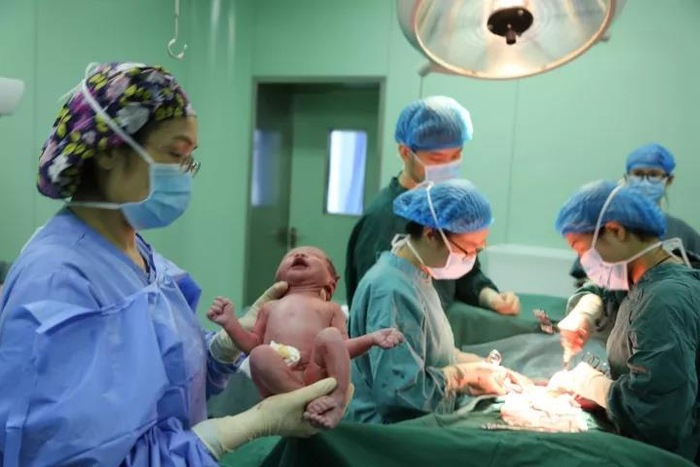 2017年10月2日,湖北省襄阳市第一人民医院手术室,护士靖虹从产科医生周宇涵手中接过剖宫产分娩的新生儿。
